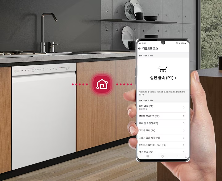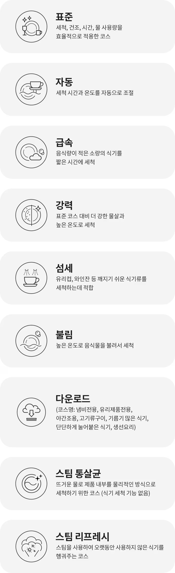 다운로드 코스 | 원하는 세척코스를 선택하여 추가할 수 있습니다. (코스명 : 냄비와 프라이팬 전용, 냄비 전용, 유리제품 전용, 야간 조용, 고기류 구이, 기름기 많은 식기, 단단하게 눌어붙은 식기, 생선요리) |